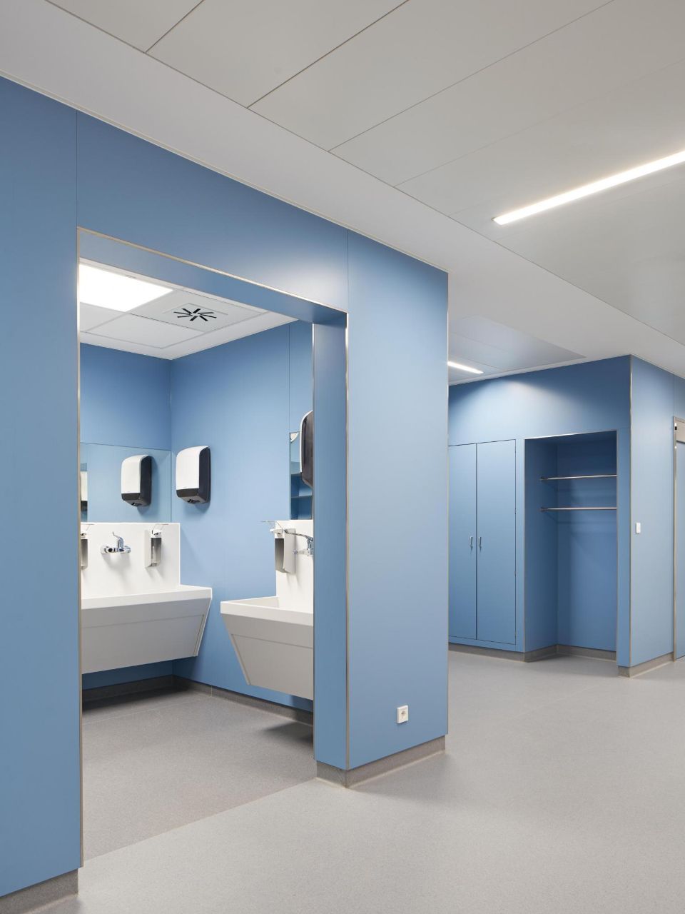 Hans-Jürgen Neugebauer underscores: “The material enabled us to meet two specific expectations. On one side, we could create a more residential look-and-feel in the ancillary areas: in the past, it was common practice, for example, to install cabinets and lockers with stainless steel doors, which was moderately inviting. This is not done anymore. On the other side, the choice of available colours allowed us to create, for the new extension, an interior design which perfectly reflects the corporate identity of Diako Mannheim. We managed to stick to the corporate design guidelines by combining several greys with a soft yellow (Pale Yellow K04.0.2) and a light blue (Powder Blue K22.2.4). From the point of view of brand recognition, this consistent colour scheme is essential”