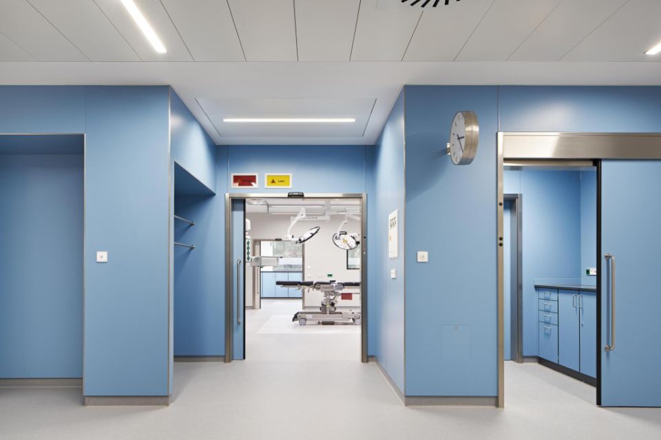 Hans-Jürgen Neugebauer was quick to realise that with its TopLab® VERTICAL range, Trespa offered the ideal wall cladding option, with the potential to meet everybody’s expectations. He points out that the material is easy to clean, while being more affordable and significantly more shock-resistant than other panels. Hans-Jürgen Neugebauer considers HPL of Trespa to be a better fit than stainless steel as well: “Uncoated stainless steel is not suitable anymore in operating theatres, especially on large surfaces: with the increasing use of laser-based surgical instruments, unintended reflections could be potentially disastrous. Accordingly, only coated stainless steel would be acceptable – and it is markedly pricier. In this respect, TopLab® VERTICAL panels represent an attractive and definitely appropriate alternative”.