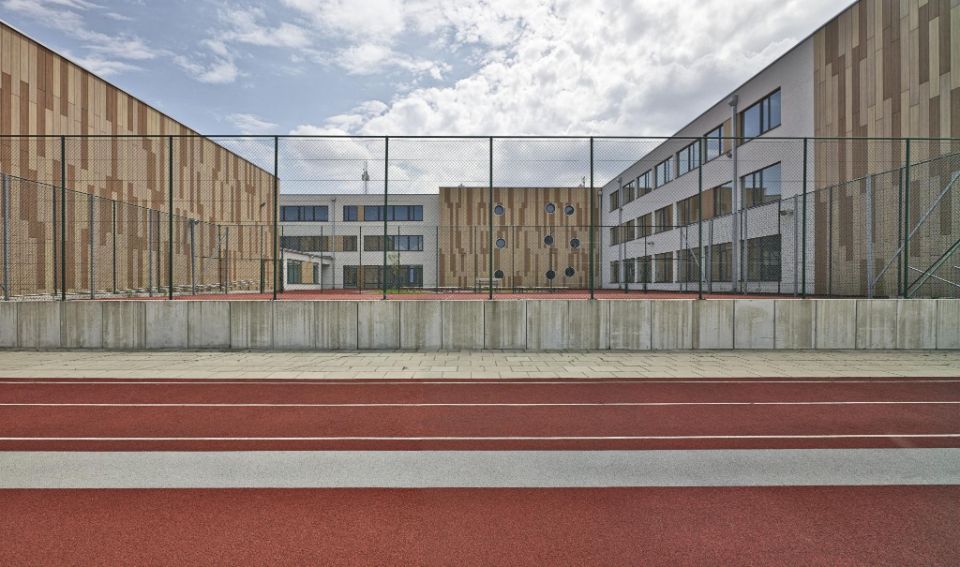 Au stade final du projet et pour concilier esthétique et enveloppe budgétaire, deux types de façade ont été utilisés en alternance sur les différents bâtiments. Pour les façades ventilées d’un vaste gymnase et pour divers autres éléments de façade, 1800 m² de panneaux Trespa® Meteon® ont été installés en liaison avec une isolation thermique en laine minérale d’épaisseur 16 cm. Cela a permis de conjuguer un fort impact visuel avec une performance énergétique d’excellent niveau. Le reste des façades a reçu un ETICS (External Thermal Insulation Composite System) en enduit sur isolant dans une finition blanche.