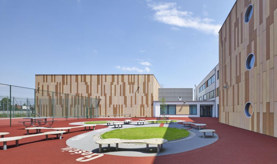 Paweł Kobryńsk précise : « Nous voulions donner aux élèves le bénéfice d’une infrastructure scolaire chaleureuse et accueillante. Parallèlement, il fallait tenir compte de la façon dont certains adolescents expriment leur créativité ». Il poursuit avec un sourire : « C’est pourquoi il importait de protéger les façades des graffitis en choisissant des matériaux adéquats ».
