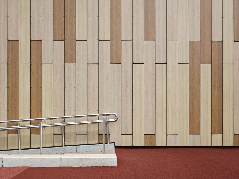 Pour obtenir un effet proche d’un bardage bois traditionnel, Front Architects avait conçu une façade ventilée très inhabituelle, tant par le format des panneaux que par la combinaison des coloris. Chaque panneau, avec une largeur de 300 mm seulement, offre un aspect proche de celui d’un clin. Par ailleurs, la juxtaposition des trois décors bois produit un effet aléatoire qui ne doit rien au hasard. En fait, le plan de calepinage spécifiait la position et la couleur exacte de chaque ‘clin’ : la seule façade principale du gymnase comprend plus de 300 panneaux de revêtement dont les décors respectifs on été spécifiés à l’unité !