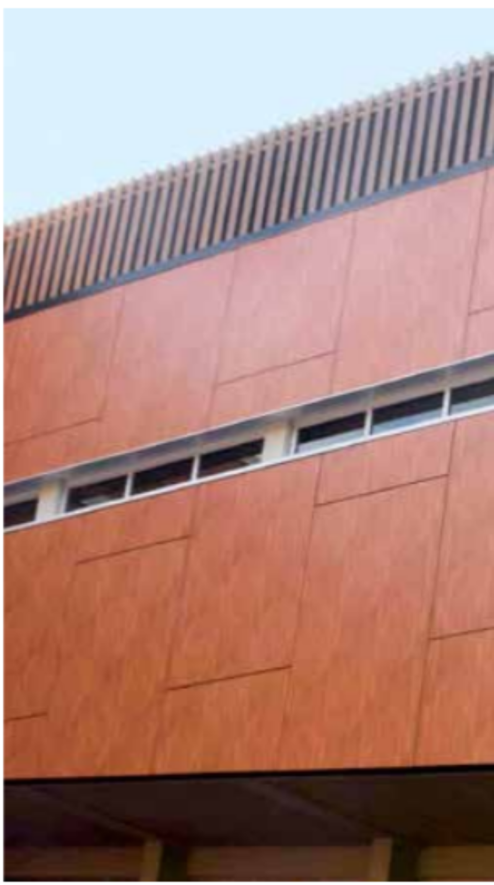 Both the architects and the college wanted to update the hall’s look, without losing the distinguished feel of the building. To accomplish this, Trespa® Meteon® panels in English Cherry were chosen. Marrying the wood aesthetic with exposed fasteners harmonized the building’s original Modernist design with Ithaca’s prestigious heritage. Also, the option to use large panel sizes offered the simplistic aesthetic the college wanted for this building. The scale of the larger panels with the increased size of the building simply made sense. Using an exterior cladding product with a great deal of design flexibility made recladding the massive building a much easier process.