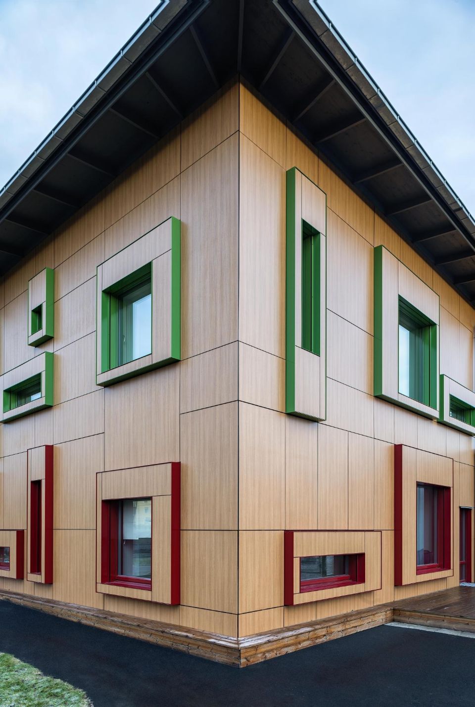 According to Jonas Kjellander, this approach made Trespa® Meteon® façade panels particularly attractive: “For 2-3 year old children, it is important that the material is interesting at close range. For them, the wood decor on the Trespa® panels feels like a landscape and stimulates their imagination. For a similar reason, we were keen not to hide the gaps in the cladding. In fact, we have played with them to create – in conjunction with the windows and the protruding, brightly coloured frames – a unifying pattern. While this arrangement might seem random at first sight, it reflects a modular logic. As such, it is perhaps the first mathematical challenge for a three year old. The arrangement makes the structure tangible and interesting, like a stringent combination of building blocks. This visual element was all the more important since we had, for the sake of thermal efficiency, to stick to a very basic, box-like exterior shape“.