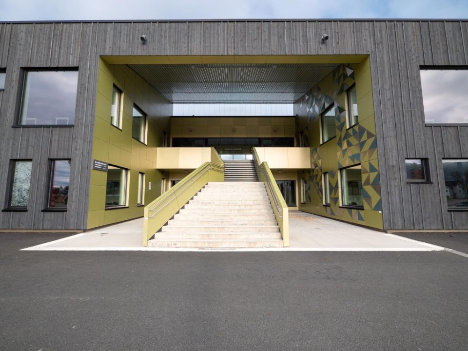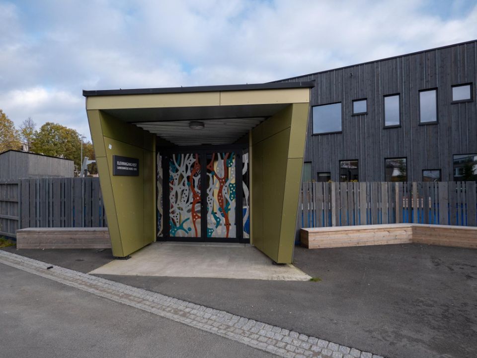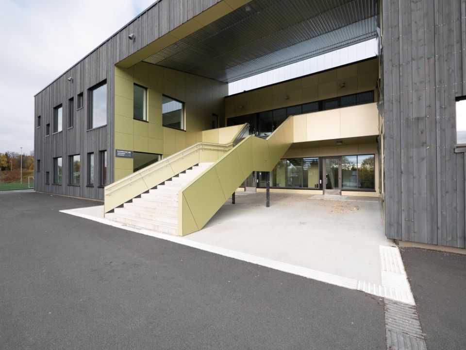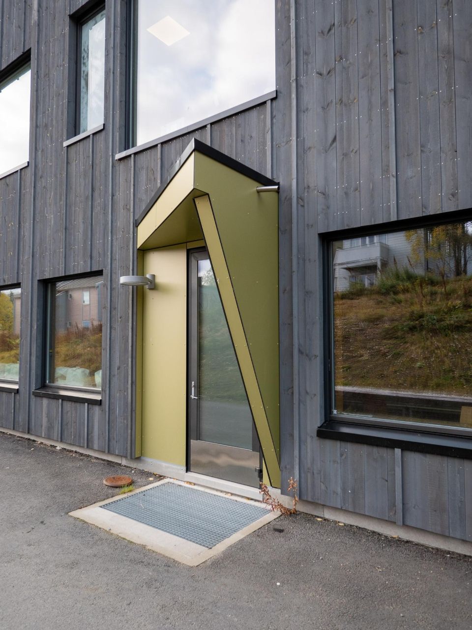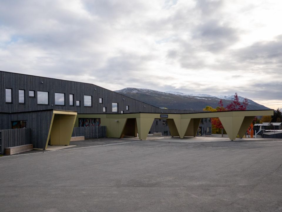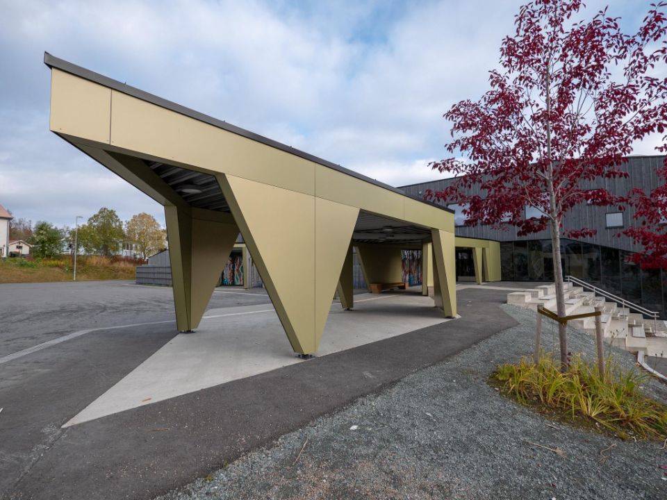 Três aspetos foram importantes para o município: a escola teve de ser construída de acordo com padrões de eficiência habitacional passiva, minimizando assim a sua pegada energética; teve de integrar perfeitamente os alunos com necessidades especiais, uma norma entre as políticas educativas; e teve de fazer bom uso dos materiais locais. Knut Brandsberg-Dahl explica: “Escolhemos madeira tratada sob pressão com acabamento em cinza escuro para a maioria das fachadas, uma opção geralmente usada na Noruega. As pranchas verticais geram um padrão rítmico atraente. No entanto, para as entradas, queríamos criar um contraste fresco e interessante, com um material diferente e liso numa cor complementar, mas claramente específica. Foi aqui que a Trespa entrou em jogo”. O edifício tem cinco entradas, todas elas cobertas ou profundamente recuadas para proteção, considerando o clima local: entre novembro de 2019 e abril de 2020, nada menos do que 6,50 metros de neve caíram em Tromsø! Uma das entradas inclui um pátio que se estende até ao estacionamento, para acessibilidade conveniente para cadeiras de rodas em qualquer clima. Todas as entradas são inteiramente revestidas com painéis Trespa® Meteon® , com o pátio alargado apoiado por uma combinação marcante de painéis laterais triangulares e trapezoidais que servem de pilares.