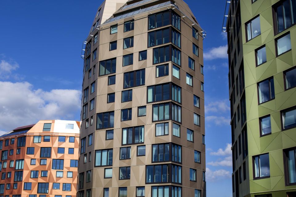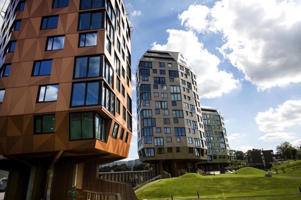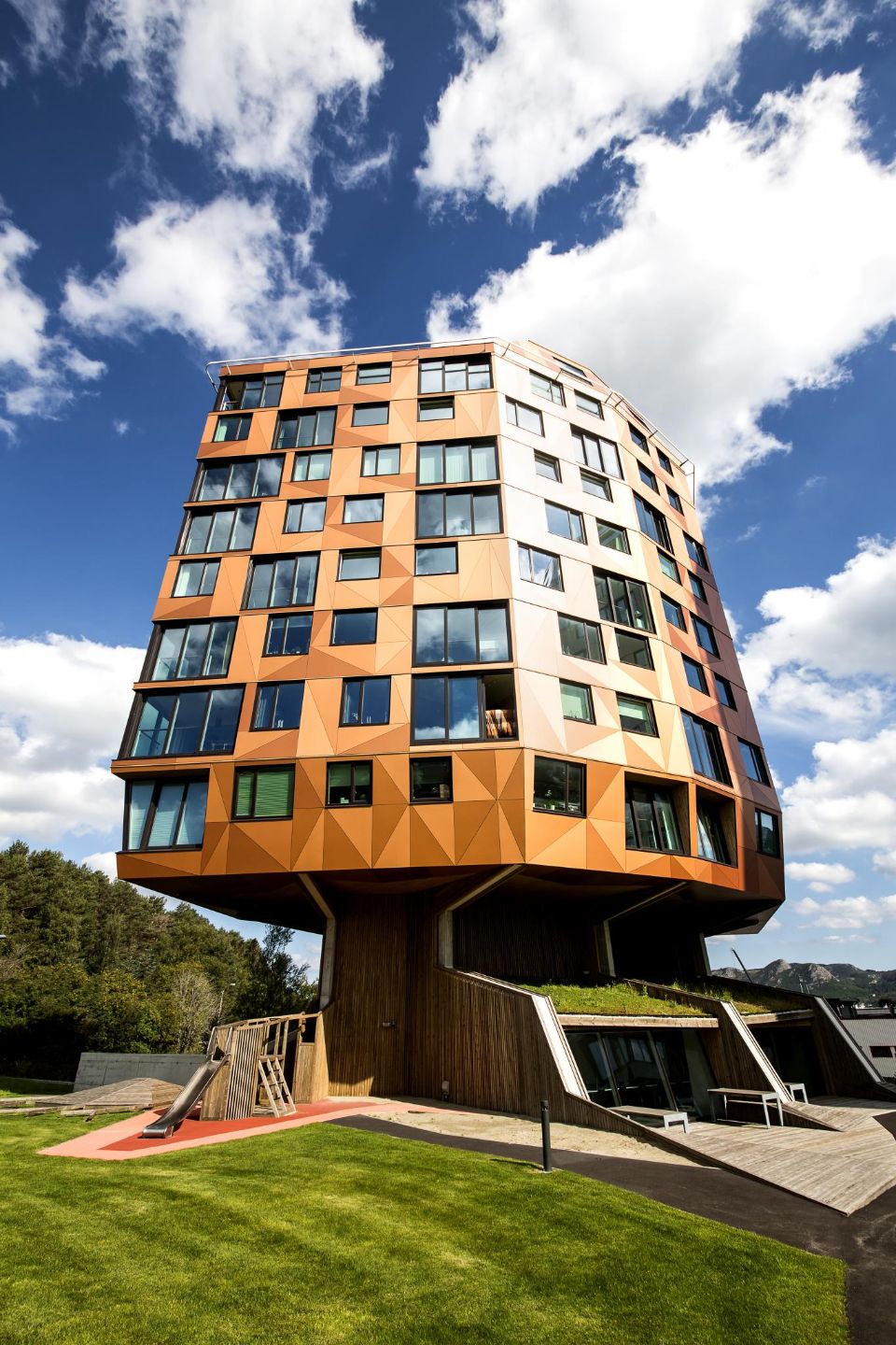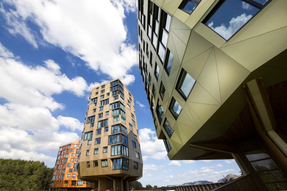 The award-winning design of the Rundeskogen Towers combines innovative forms and materials, while guaranteeing residents and neighbors breathtaking views of the Norwegian fjords.