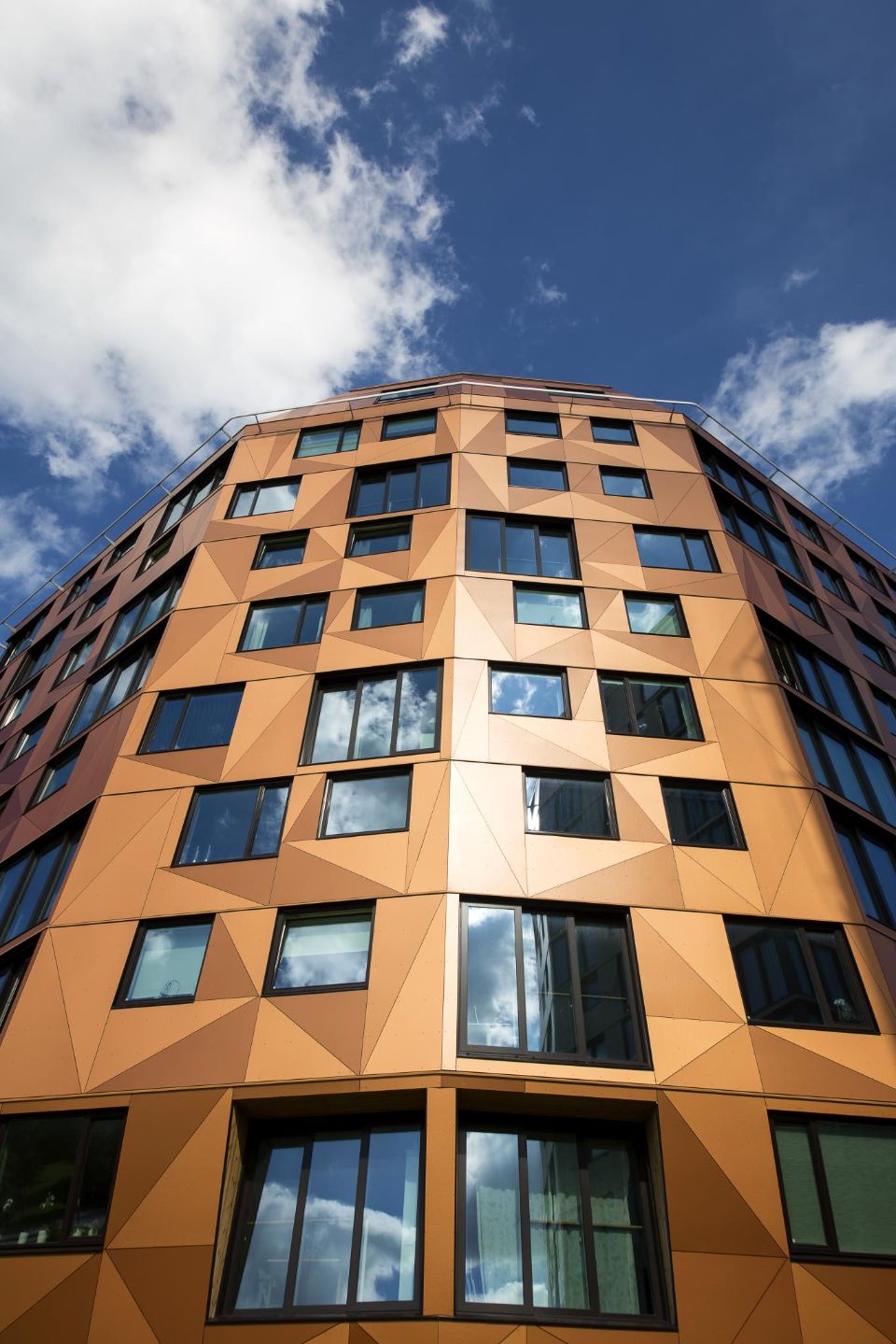 To understand if a similar solution could be suitable for the Rundeskogen project, de Rijke visited Trespa International’s headquarters in Weert, where a 4 x 4 meters mockup was built in Copper Yellow. “ The Trespa® Meteon® Rundess were absolutely key to create a playful façade.” Siv Helene Stangeland, partner and principal architect at Helen & Hard 11 Rundeskogen Towers is gave the architects, constructor, distributor and client a real-size example of how the façade would look like by playing with geometrical shapes and rotating the directional surface of the Metallics cladding panels. Ultimately, they agreed on three Metallics decors: Copper Yellow, Amber and Mustard Yellow. Each building would be clad with one of these complementary tonalities following an intricate pattern that included carefully arranged triangular-shaped cladding panels.